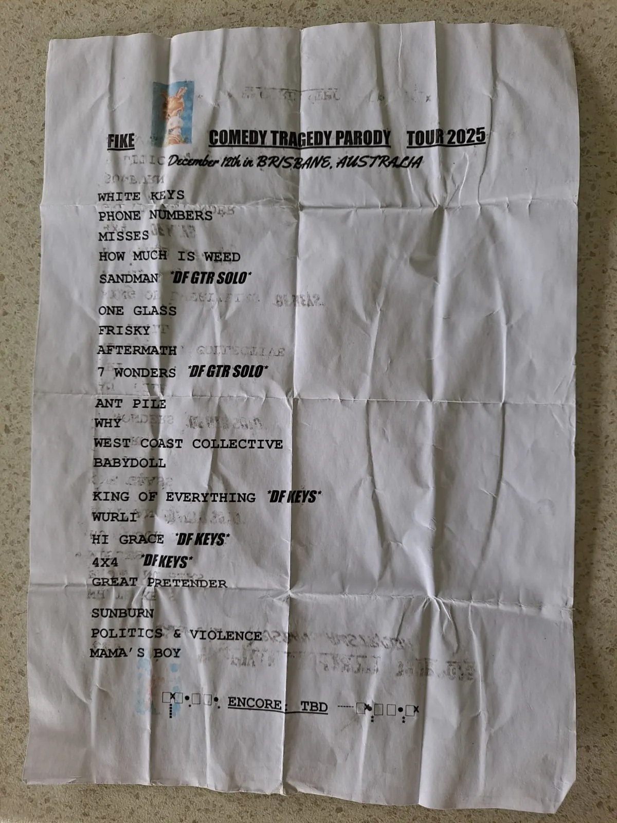 Based on this assessment, it is our considered professional opinion that the Dominic Fike setlist is consistent with an authentic working setlist from the Riverstage Brisbane performance on 12 December 2025, and that the accompanying Dunlop Tortex plectrum is consistent with legitimate tour-related stage equipment associated with the performance.